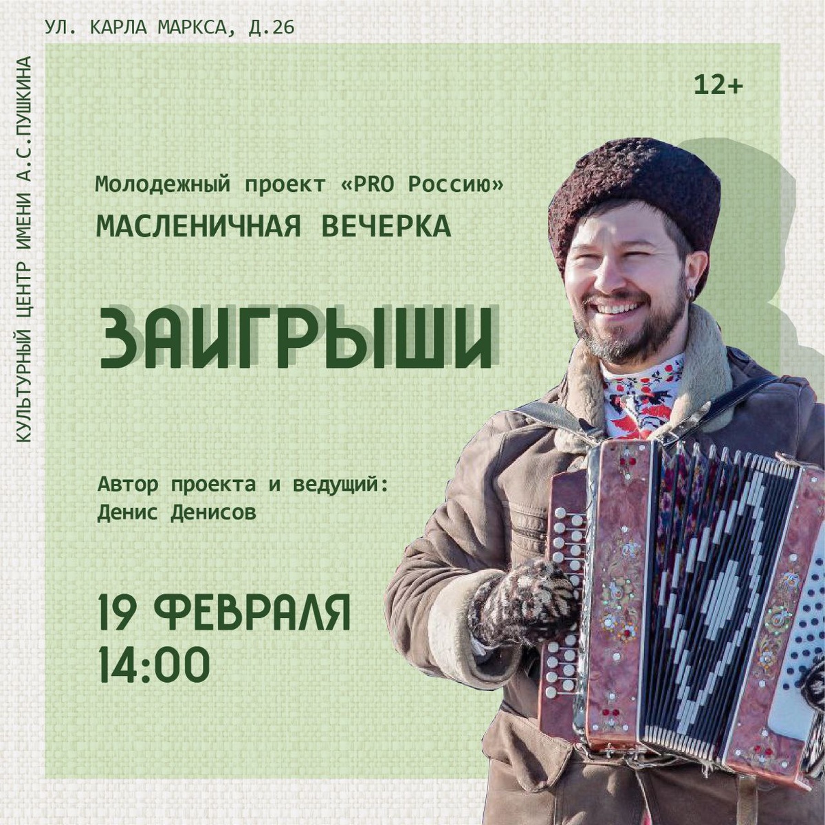 🪗 В КЦ им. А.С. Пушкина пройдет масленичная вечерка «Заигрыши». Гости ознакомятся с традициями и историей празднования Масленицы в нашей республике. Каждый день этой недели имеет свои обряды и развлечения. В программе - народные игры и особенные масленичные забавы. Ведущий программы и автор проекта - заслуженный артист РТ Денис Денисов. 📆19 февраля, начало в 14:00 Билеты здесь 📍Есть льготы - подробнее тут 📞Справки по телефону: +7 908 339-02-92 #чакчакновости Чак-чакнорис