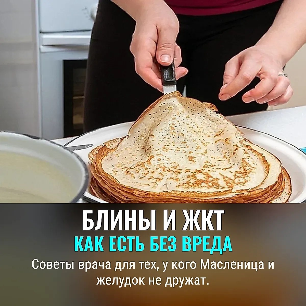 Но если у вас проблемы с ЖКТ, стоит соблюдать дробное питание и не гнаться за количеством. Врач Чернышова напоминает: ешьте до 80% от чувства сытости — желудок скажет спасибо. Чтобы снизить жирность, не смазывайте каждый блин маслом — просто добавьте немного растительного прямо в тесто и жарьте на тефлоновой сковороде. Так и вкус, и желудок в порядке 😌 Блины лучше делать одним приемом пищи, а не на завтрак, обед и ужин подряд. Пусть они займут не больше 20% дневного рациона, а остальное время уделите овощам: капусте, свёкле, тыкве, моркови. И главный лайфхак — перекусите заранее. Тогда за стол вы сядете не голодными, а с чувством меры и лёгкости 💪 Москва Здорова / Нет времени болеть