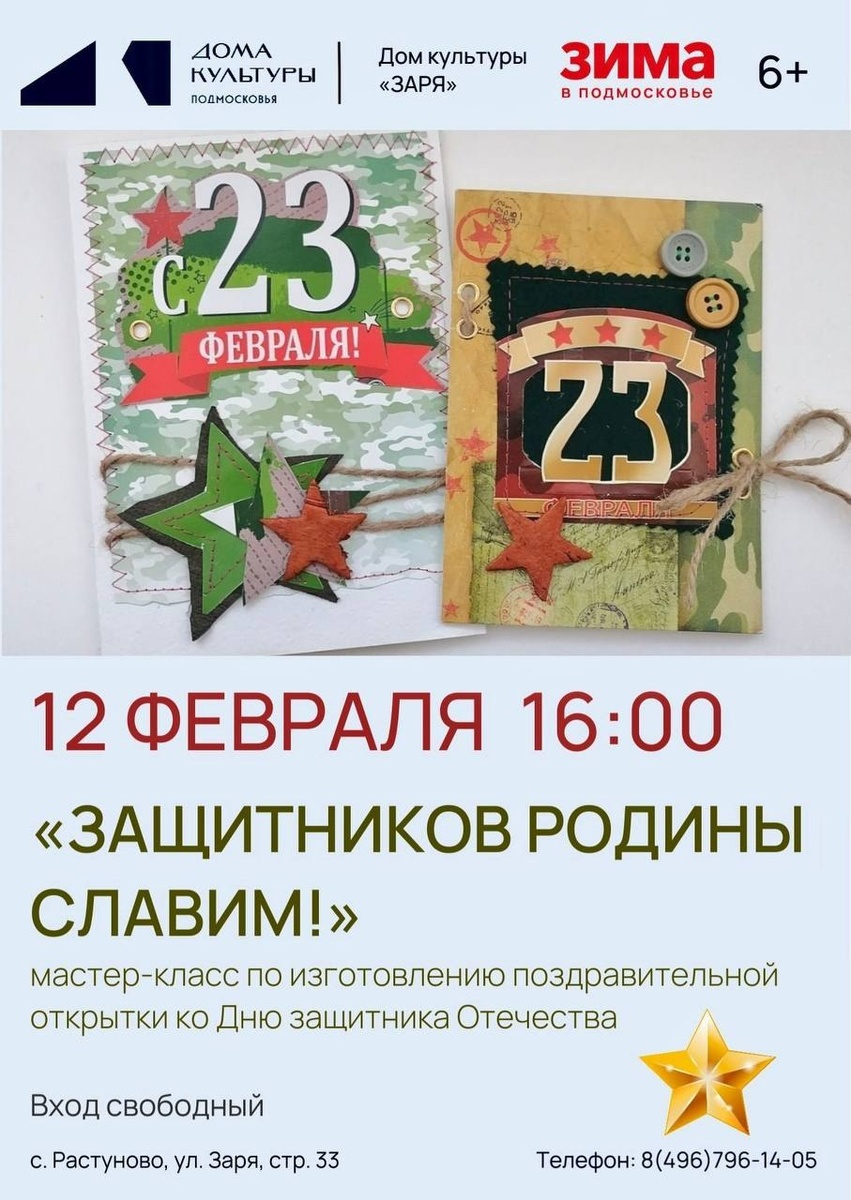 ✨ ✂️ МАСТЕР-КЛАСС ✂️ Сельский Дом культуры «Заря» приглашает всех желающих на мастер-класс по изготовлению поздравительной открытки к 23 Февраля «ЗАЩИТНИКОВ РОДИНЫ СЛАВИМ!» ⭐️ 🚫 Возраст: 6+ 📆 12.02.2026🕒16:00 🏢 Сельский дом культуры (СДК) «Заря» 📍 г.о.Домодедово, с.Растуново, ул.Заря, д.33 💰 Вход свободный❗️ ✅ Мероприятия Домодедово https://dzen.ru/id/66f10385cc4c5a16f7b5fb02 http://vk.com/domodedovo_events http://dzen.ru/domodedovo_events