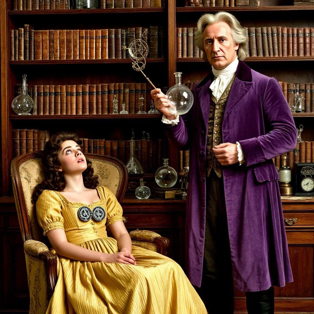 Лаборатория алхимика;медика: полки с фолиантами в кожаных переплётах, хрустальные колбы, астролябия на столе. В центре — молодая женщина в муаровом платье, откинувшаяся на кресле; на груди два магнита. Её лицо выражает изумление, рука сжимает вышитый платок. Месмер в белом парике и камзоле цвета бордо наклоняется к ней, в глазах — смесь научного азарта и сострадания. Сквозь витражное окно льётся золотистый свет. Детали: перламутровые блики на фарфоре, мерцание позолоты. Стиль: Жан;Батист Шарден, приглушённые тона.