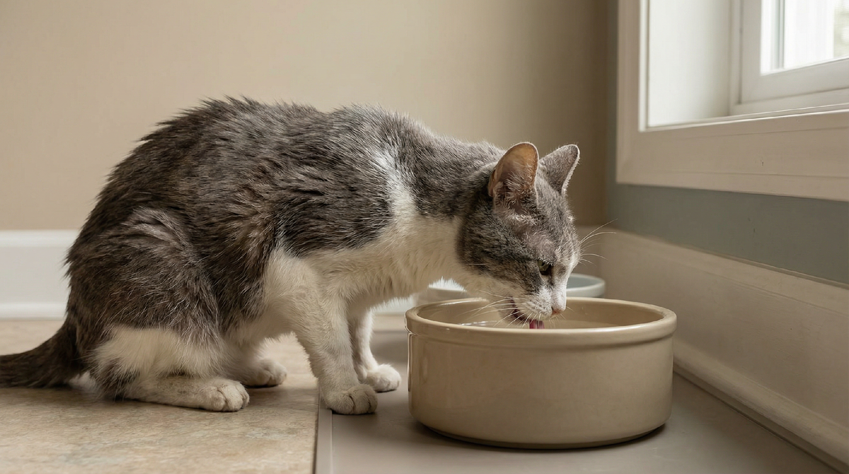 Первый признак, который легко пропустить. Кошка начинает пить больше воды. Не в два раза сразу, а постепенно. Вы замечаете, что миска пустеет быстрее. Лоток наполняется крупными мокрыми комками чаще, чем раньше. Это полидипсия и полиурия. Почки теряют способность концентрировать мочу, жидкость выходит быстрее, организм требует больше воды.
