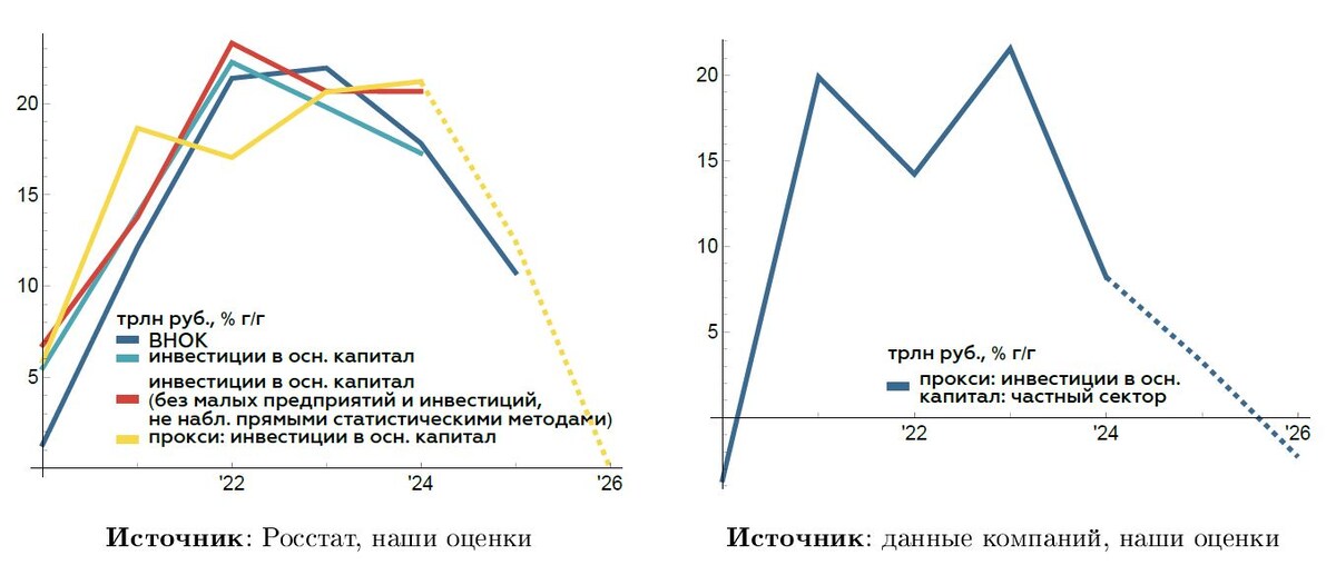 Телеграм-канал «Твердые цифры» сложил инвестпрограммы крупнейших компаний страны на 2026 год и пришел к грустным выводам: «Если собрать вместе инвестпрограммы 60+ крупнейших компаний как прокси на частные инвестиции и инвестиционные расходы бюджета, то в 2026 номинальные инвестиции могут быть неизменными год/к году => в реальном выражении ВНОК* может и вовсе сократиться. *ВНОК — валовое накопление основного капитала, один из показателей инвестиций». В 2025 году обвал инвестиций уже начался (в реальном выражении). ВНОК рос: ✔️в среднем за 2021-2024 — на 8,9%, ✔️в 2025 — 1,7% (ниже дефляторов). ✔️ В 2026 году ВНОК достиг потолка и расти не будет, что означает его падение в реальном выражении на 5% (если использовать ожидаемый в прогнозе Минэкономразвития дефлятор по строительству). Частные инвестиции падают даже номинально, общий показатель держится около нуля за счет бюджета. Мы уже писали почему крупнейшие компании вынуждены сокращать свои инвестпрограммы в 2026 на примере РЖД. В реаль