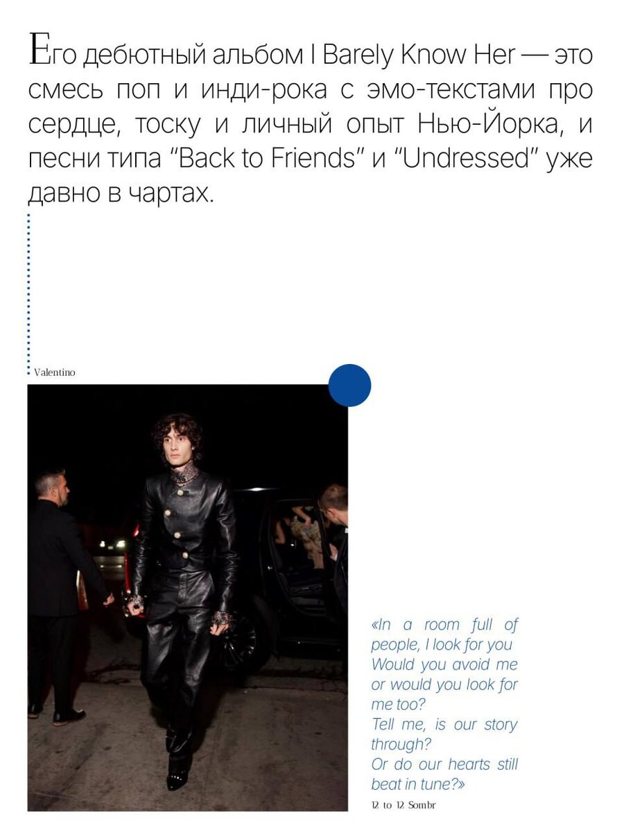 Он ворвался в мейнстрим через TikTok, где его песни и вайб подхватили миллионы — так Sombr резко оказался в центре музыкальной и модной сцены. Его дебютный альбом “I Barely Know Her” — это смесь поп и инди-рока с эмо-текстами про сердце, тоску и личный опыт Нью-Йорка, и песни типа “Back to Friends” и “Undressed” уже давно в чартах. Sombr — как будто смешал диско-шар, романтику инди-рока и глам-рок драму, и у него получилось что-то свое, дерзкое и визуально узнаваемое. Изучаем подробнее его работу со стилистом, стайл-трики и фэшн-выходы на церемонии награждения в наших карточках!