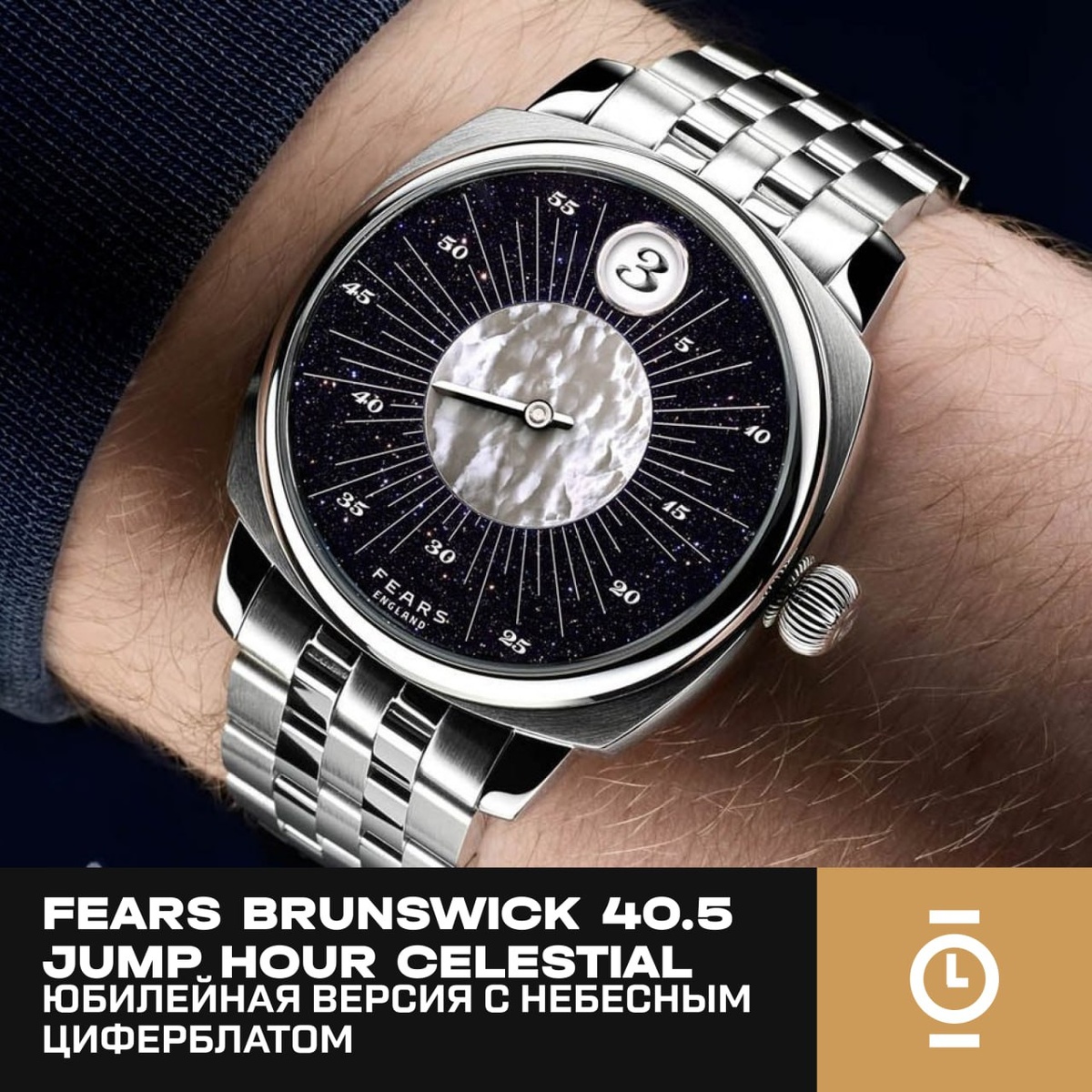 #новости_WD Британская компания Fears Watch Company отмечает сразу две важные даты: 180 лет с момента основания в 1846 году и 10 лет с момента возрождения бренда под руководством Николаса Боумена-Скаргилла. В честь этого события марка представила особую лимитированную модель — Brunswick 40.5 Jump Hour “Celestial”, выполненную в поэтичной «космической» эстетике. Корпус часов изготовлен из нержавеющей стали и имеет фирменную подушкообразную форму Brunswick. Диаметр составляет 40,5 мм, толщина — 12,8 мм, расстояние от ушка до ушка — 47 мм. Верхняя часть корпуса сатинирована по кругу, а безель, боковые поверхности и ушки отполированы. Заводная головка «луковичного» типа расположена на отметке «3 часа». Водозащита стандартная для модели. Покупатель может выбрать между глухой задней крышкой и сапфировым стеклом. Внутри установлен автоматический калибр Sellita SW200 с частотой 28 800 пк/ч, 25 камнями и запасом хода 38 часов. Поверх базового механизма установлен модуль прыгающего часа JJ01,