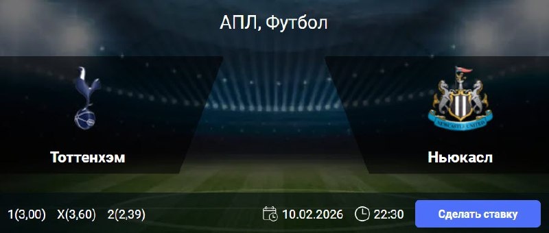 Статистика Тоттенхэма: Статистика последних выступлений свидетельствует о проблемах в обороне: в пяти крайних турах команда пропускала минимум дважды, а ставка «обе забьют» сыграла в пяти из шести предыдущих встреч. Кроме того, фактор своего поля перестал быть преимуществом: в 11 последних домашних матчах АПЛ одержана лишь одна победа при шести поражениях. Статистика Ньюкасла: Гостевая статистика «Ньюкасла» выглядит удручающе: клуб не смог победить в 13 из 15 последних выездов в рамках Премьер-лиги. При этом результативность в гостях оставляет желать лучшего — не более одного гола в 13 из 15 случаев. Также стоит отметить слабую игру в первых таймах, где команда не выигрывала на протяжении семи матчей подряд. 🎯 ТБ (2,5) 🎲 кф (1,74) 👉 СДЕЛАТЬ СТАВКУ 🎁 ФРИБЕТ WINLINE - 3000₽ (промокод: BETWIN) 👉 СМОТРЕТЬ ПРОГНОЗ