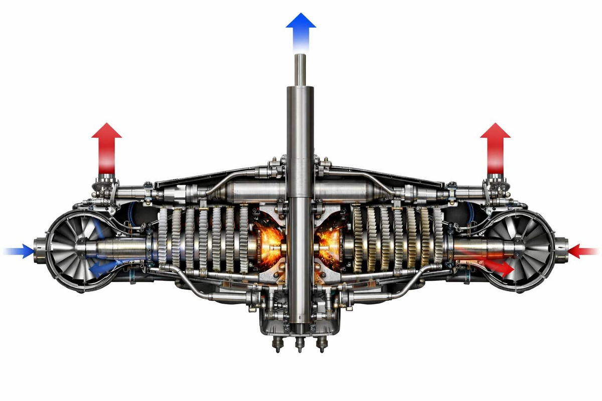 Чтобы понять гениальность замысла, нужно заглянуть внутрь. Двигатель собран по, казалось бы, классической одновальной схеме: всё крутится на одном валу. Но дальше начинается инженерное волшебство. Вместо привычного набора дисков на этот вал «нанизаны» два совершенно разных компрессора, работающих в тандеме. Сверху расположен биротативный центростремительный компрессор — сложный узел, где части лопаток вращаются в противоположных направлениях, эффективно «загребая» и сжимая воздух. Прямо под ним, на том же валу, находится более традиционный, но мощный центробежный компрессор. Он работает как праща: раскрученный воздух отбрасывается к периферии с огромной силой.