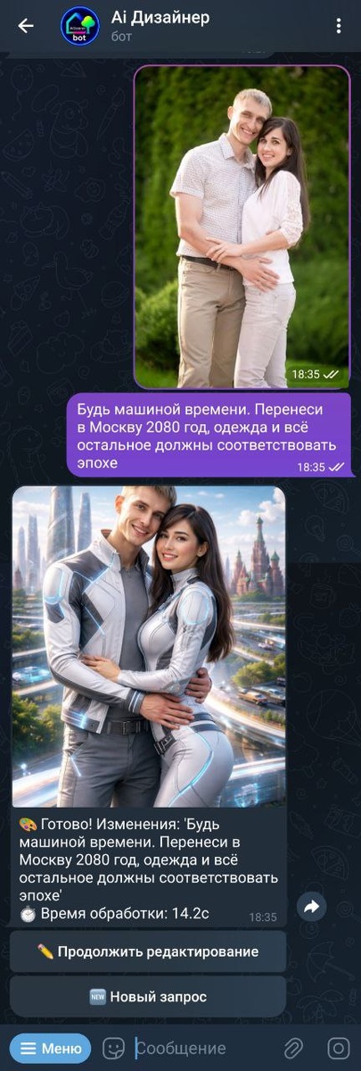 ? А может, пройтись по улочкам прошлого? Теперь это возможно без долгих ожиданий! Представляем новую магию: «Машина времени» в вашем телефоне. ⚡ Отправьте своё фото и одну волшебную команду — и нейросеть перенесёт вас в любую эпоху! 👉 Например, напишите: «Будь машиной времени. Перенеси в Москву 2080 год, одежда и всё остальное должны соответствовать эпохе.» …и увидите себя в футуристическом городе будущего. 👉 Или попробуйте: «Будь машиной времени. Перенеси в Париж 16-го века, одежда и всё остальное должны соответствовать эпохе.» …и увидите прошлое) Как это работает? 1. 📸 Ваше фото (чем четче лицо, тем лучше). 2. ✍️ Чёткий запрос-команда (как в примерах выше). 3. ⏳ Несколько секунд ожидания — и вы уже не в нашем времени! Куда отправитесь ВЫ? В будущее или в прошлое? ➡️ Начать путешествие: @aidizainer_bot
