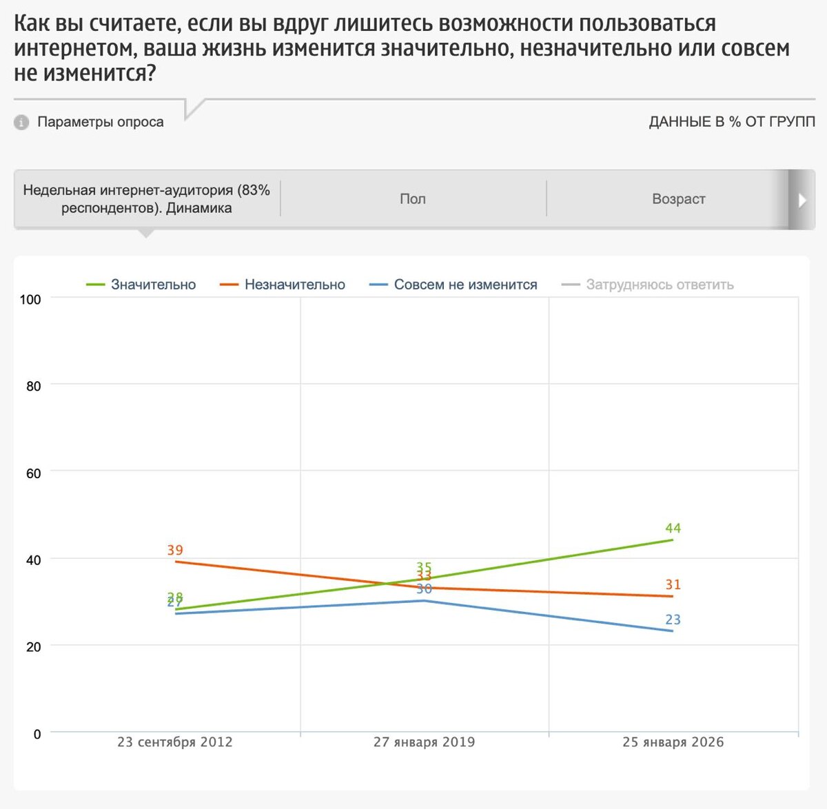 ? По данным последнего опроса ФОМа, недельная аудитория интернета составила 83% россиян. Кроме того, выяснилось, что 65% из этой аудитории считают, что в целом изобретение интернета принесло людям больше хорошего. Среди плюсов они чаще всего называют доступность информации и возможность общаться. Однако 16% думаю, что минусов от изобретения Сети больше. Среди них – негативное влияние на детей и подростков, а также обилие ложной и негативной информации. 44% считают, что без интернета их жизнь изменится сильно, 31% – что незначительно, 23% – что совсем не изменится. Подробнее: fom.ru #интернет 📱 Фонд Общественное Мнение