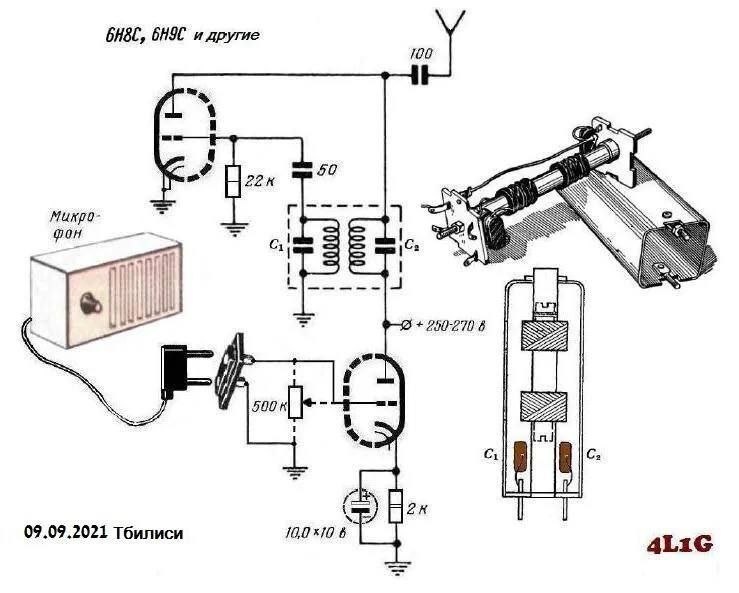 Генератор состоит из старой катушки ПЧ или УПЧ от ламповых приемников на октальных лампах, обеспечивающей сильную индуктивную связь между входом и выходом схемы через самую катушки. Таким образом, частота колебаний будет порядка 465 кГц, попадая в промежуточный диапазон приемника. Катушка имеет переменную индуктивность, мы должны разобрать ее, заменив настроечные конденсаторы С1 и С2 (которые, как правило, имеют порядок от 120 до 240 пФ) на другие от 30 до 50 пф, таким образом, чтобы частота колебаний попадала в диапазоне средние волны . В качестве микрофона можно использовать радио проводного вещания, или же динамик и выходной трансформатор от ламповых приемников. Антенна генератора составляет медный провод длиной 12 метров и диаметром 0,3-0,5 мм., подвешенный во дворе на деревьях высотой 6-15 м. ➖➖➖➖ РАДИО(73!)