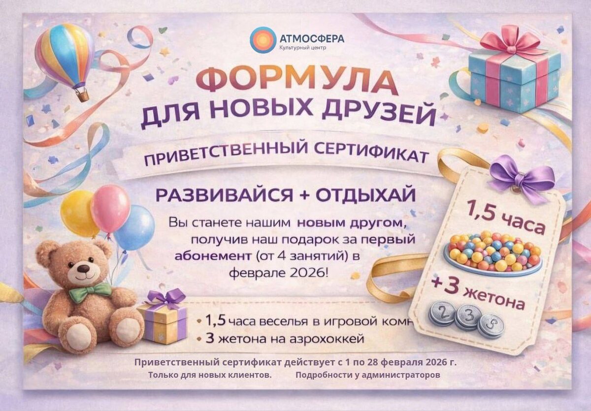 ! 🎇 📌Февраль в КЦ «Атмосфера» ещё в самом разгаре, а вместе с ним — наша тёплая акция «Формула для новых друзей» Если вы ещё только планируете к нам прийти впервые — сейчас самое время. Мы подготовили для вас два приятных варианта старта: Вариант 1️⃣ — «Развивайся + Отдыхай» Купите первый абонемент на секцию от 4 занятий → получаете в подарок 1,5 часа в игровой комнате + 3 жетона на аэрохоккей. Вариант 2️⃣ — «Отдохни + Попробуй» Купите от 1 часа в игровой комнате → получаете в подарок пробное занятие в любой секции. 💜Акция работает до 28 февраля включительно и только для новых гостей. ✅Приходите на ресепшен, скажите администратору волшебную фразу «Я новый друг» — и мы сразу оформим ваш приветственный сертификат. Мы ждём именно вас 🧤🫶 Пусть февраль станет месяцем вашего первого классного впечатления от «Атмосферы». @KC_Atmosfera