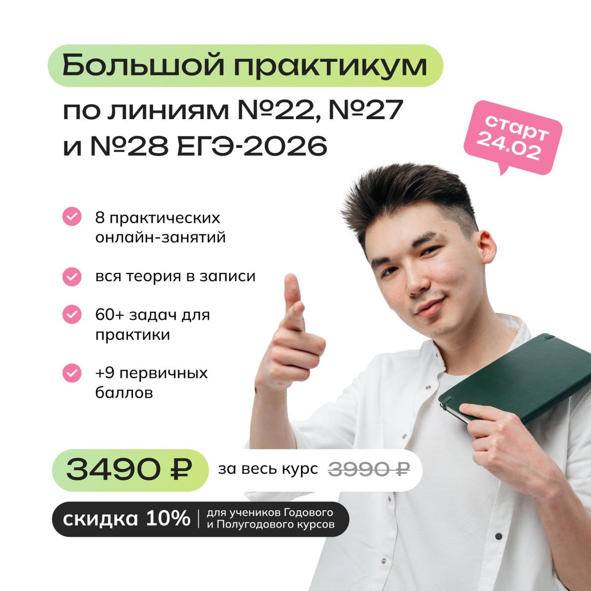 ✔️ За 4 недели вы сможете освоить 3 из 7 заданий второй части, за которые можно получить 9 первичных баллов на ЕГЭ! ⚡️ Старт курса 24 февраля Все темы, которые спрашивают в этих линиях, — эксперимент, Харди-Вайнберг, синтез белка, генетика — сами по себе НЕ сложные. Подвох заданий — в разных сценариях и в оформлении. По поводу оформления существует стооолько мифов... На практикуме мы с вами повторим все термины. Решим 60+ заданий разных сценариев и разберёмся, где, как и что писать в ответе, чтобы за него ставили максимум. ➕ Что конкретно будет на курсе? Занятие 1 — Эксперимент Всего за 2 часа заработаем 3/3 баллов за 22 задание. Узнаем, как определить отрицательный контроль, в чём подвох разных дизайнов эксперимента. И что делать, когда в эксперименте больше двух независимых и зависимых переменных? Занятие 2 — Харди-Вайнберг Проходим закон ХВ для 27 линии. Как правильно пояснить ход решения задачи? Как посчитать долю особей после гибели части особей? На каких формулировках вы т