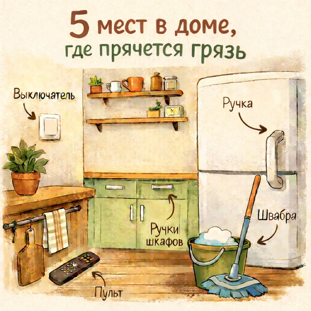 😅 Есть места, которые выглядят безобидно, но именно там скапливается больше всего грязи. Вот 5 «невидимых» зон: 1️⃣ выключатели 2️⃣ ручки шкафов 3️⃣ пульты 4️⃣ ручка холодильника 5️⃣ швабра после уборки 💡 Лайфхак: просто протирайте их по пути — 10 секунд, а разница в чистоте заметная. Сохраните, чтобы не забыть 👌😉