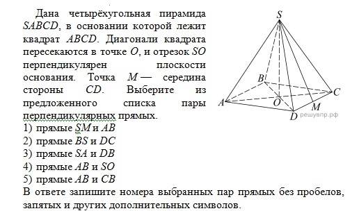 Кому полезно: учащимся 10,11 классов Давайте сразу начнём с задачи (разбираем задание 12 ВПР, 10 класс): 1) Рассмотрим прямые SM и АВ Кстати, саму теорему можно повторить здесь 2) Рассмотрим прямые BS и ДС. Они не перпендикулярны 3) Рассмотрим прямые SA и ДВ 4) Рассмотрим прямые АВ и SO Так как SO перпендикуляр к плоскости основания, а прямая АВ лежит в этой плоскости, то SО перпендикуляр к АВ Собственно говоря SО перпендикуляр и к любой другой прямой плоскости основания, то есть и к ВС, и к АД и к ДС и к ВД и к АС 5) Рассмотрим прямые АВ и СВ. Они перпендикулярны, так как это стороны квадрата Ответ: 1345 Решите самостоятельно (ответ в конце публикации) Задача №3 Здесь нужно вспомнить определение прямой призмы Прямая призма — это призма, у которой боковые рёбра перпендикулярны плоскости оснований. Исходя из этого получаем ответ: 23 Задача №4 1) Рассмотрим прямые SA и BN 2) Рассмотрим прямые AN и NP 3) Рассмотрим прямые SN и АС: они не перпендикулярны , так как в плоскости АSC через
