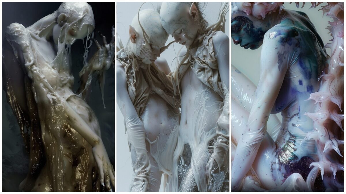 Поиски покоя и самодостаточности перед лицом экзистенциального ужаса Фотограф Анастасия Воробьева, работающая под псевдонимом Rosemary, столкнулась с миром технологий и шагнула ему навстречу. Сегодня она позиционирует себя не как арт-fashion-фотограф-дизайнер (нужное подчеркнуть), а как творец новой формации — креатор! В работах Rosemary человек предстает как иной биологический вид: все модели покрыты слизью, будто они только что появились на свет. Среди них есть и автопортреты, и реальные съемки, и AI-модели, то есть симбиотические креатуры, созданные в сотворчестве с машиной. Венера явилась в мир с меланхоличным взглядом и в стыдливой позе Когда-то «Рожде