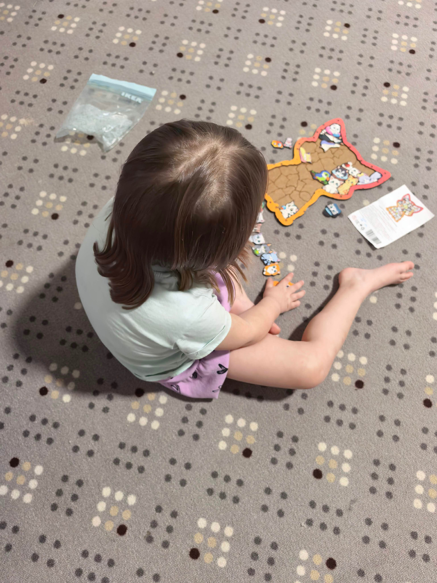 Тем временем дочку не отпускает любовь к ножницам. В прошлом месяце мы с Тишей даже убрали повыше все его ножницы, потому что Василиса начала перекраивать одежду. Но дочь быстро просекла, где лежат маникюрные. В общем, за 15 минут постригла куклу и подрезала себе юбку. Резать бумагу и картон ей явно неинтересно — аппликаций и так хватает на занятиях в кружках. Душа требует масштаба, ткани и ощущения «я творю».