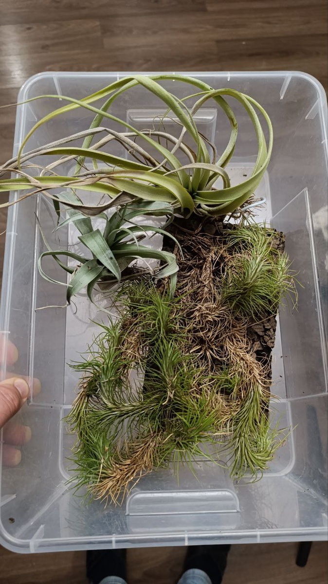 Поделюсь своей печалью. С трудом выжившие тилландсии, пережившие засуху Воронежа (оказались там без присмотра и почти без полива в заброшенном флорариуме), мой игнор и жаркое солнце Крыма, переехавшие со мной в Сочи. Орхидея ванилька, год живущая в контейнере на кусочке влажного сфагнума, поливавшаяся за это время раза три. И неоргелия (на фото не попала - напишу про неё позже). Они дождались меня. Я наконец ими занялся. Для начала обобрал засохшие листья, искупал и выложил отдыхать на свежий воздух. Некоторые тилландсии, как видно, переехали в контейнер к орхидее. Жду тёплую погоду, что бы перевести их на улицу. Тилландсия функиана конечно сильно пострадала. Вид потеряла и некоторые ветки пришлось отрывать. Вот такие вот дела.
