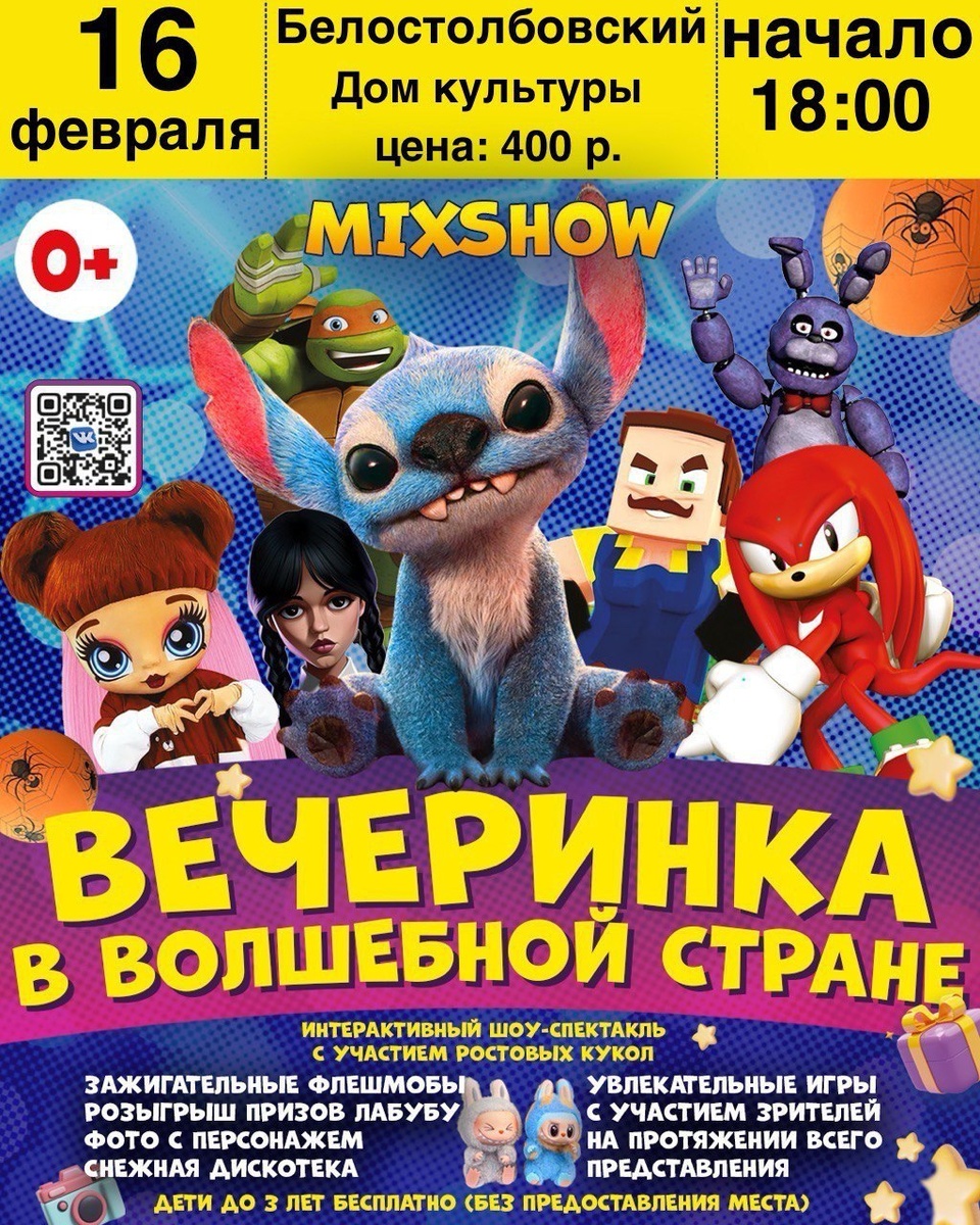 ✨ Друзья! И вновь хорошие новости, для вас и ваших детей 🤗 📣БЕЛЫЕ СТОЛБЫ📣 Приглашаем,Вас получить массу положительных эмоций от игры,с потрясающими персонажами! 💥 ➡️ ВАС ЖДЁТ: Бони ,Ехидна Наклз, очаровательная Уэнсдей,привет Сосед,и другие! 👉 А ТАК ЖЕ: снежная дискотека, лазерная анимация,зажигательные флешмобы, игры со зрителем на протяжении всего шоу, продажа сувениров,розыгрыш призов, и конечно же, фото с любимыми персонажами! 🚫 Возраст: 0+ 📆 16.02.2026🕒18:00 🏢 Белостолбовский городской Дом культуры (ГДК) 📍 г.о.Домодедово, мкрн.Белые Cтолбы, ул. Авенариуса стр. 1а 💰 Цена: 400 ₽ ✅ Мероприятия Домодедово https://dzen.ru/id/66f10385cc4c5a16f7b5fb02 http://vk.com/domodedovo_events http://dzen.ru/domodedovo_events