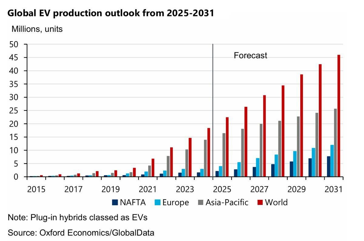 Глобальное производство электромобилей резко ускорилось после 2025 года, вырастя до ~45-50 миллионов единиц к 2031 году, что знаменует собой четкий переход от раннего внедрения к массовому производству. Азиатско-Тихоокеанский регион доминирует в объемах, на его долю приходится наибольшая доля роста, что отражает глубину цепочки поставок, преимущества масштаба и политическую поддержку. Европа неуклонно растет, но остается вторым уровнем, с расширением, ограниченным затратами, инфраструктурными пробелами и неравномерным спросом. Даже консервативные прогнозы подразумевают структурно более высокий спрос на входные данные, связанные с электромобилями (металлы, электроэнергия, сети), это история объема, а не цикл шумихи. На подходе ещё 1 млн роботов от Тесла и китайцы тоже запускают производство. Источник: Серебряный Институт #серебро #аналитика #электромобили #роботы #тесла