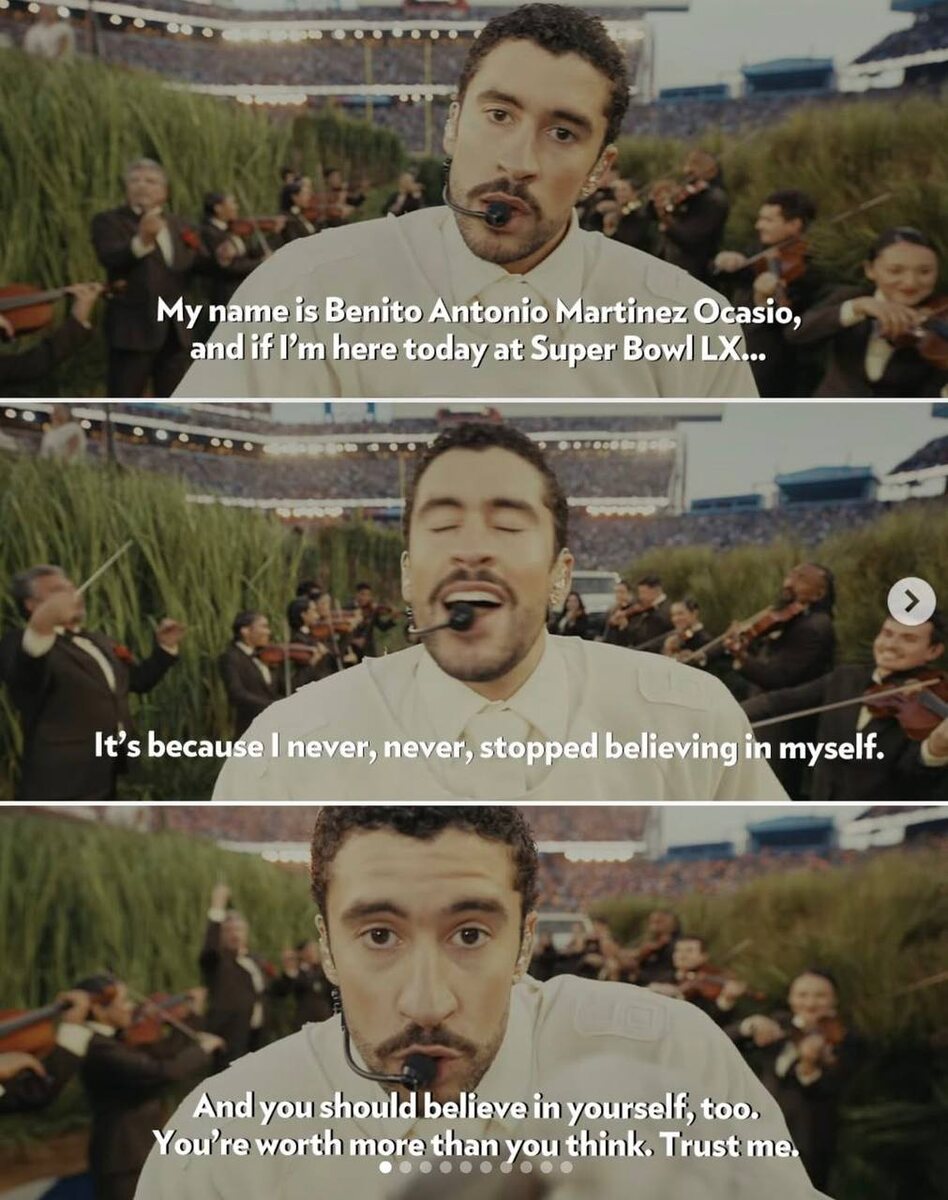 Триггернуло многих, включая Дональда Трампа, который назвал шоу “slap in the face to our country”. Разбираемся, что там вообще произошло. - Начало на сахарной плантации Прямой символ колониального прошлого Пуэрто-Рико. Кстати, все соцсети завидуют «grass» - людям в костюмах травы. Типа, «а что так можно было?», «это было бы вершиной моей карьеры», «new career path unlocked - professional schrub». - Образ и одежда Bad Bunny выбрал Zara (что для Super Bowl почти преступление - как же так, “бренд для простолюдинов”). Джерси с номером 64 и фамилией Ocasio - отсылка к семье: дяде и маме. - La Casita Bad Bunny прогулялся с нами по улицам Пуэрто-Рико: киоски, кокосы, белые пластиковые стулья. Забежал к Toñita - легенде Нью-Йорка и владелице Caribbean Social Club, который 50 лет как дом родной для латиноамериканцев. Продолжение в комментариях 👇🏻