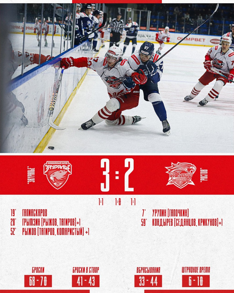 ХК "Ростов" уступил "Зауралью" со счетом 2:3 - Гол в концовке не помог спасти встречу при пустых воротах. Тем не менее матч запомнится ярким началом и волевыми последними минутами. Двигаемся дальше, - сообщили в соцсетях команды.