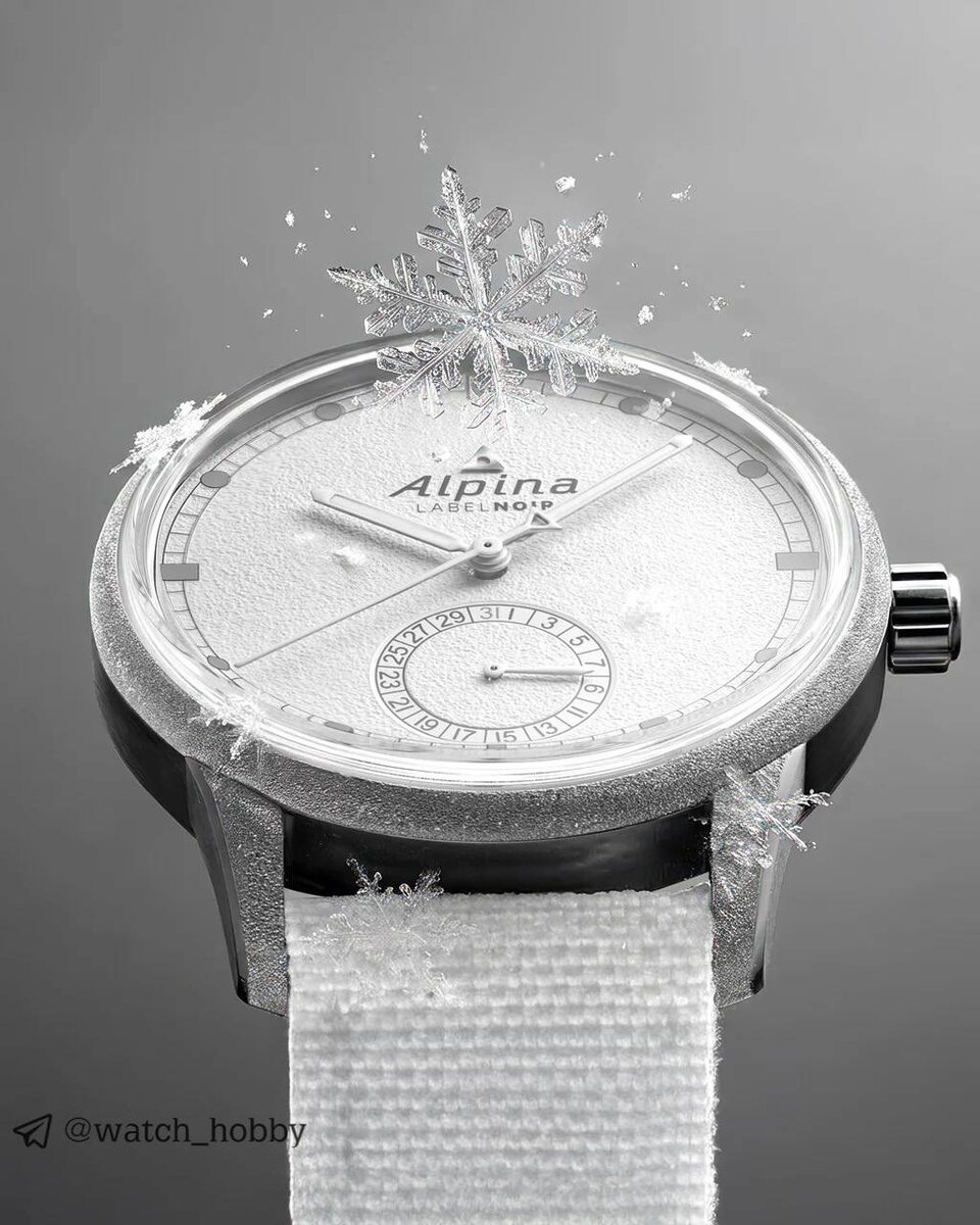 Ода чистоте заснеженных горных вершин - коллаборация мануфактуры Alpina и дизайн-студии Label Noir ❄️ Что с характеристиками: - Корпус из стали - Ремешок из текстиля - Фактурный циферблат - Размер корпуса: 41.5 мм - Высота корпуса: 13 мм - Сатиновая и зеркальная полировка - Сапфировое стекло - Водозащита 50 метров - Дата - Автоматический калибр Alpina AL-706 с запасом хода в 72 часа Новинка сделана полностью в белых тонах, от циферблата до ремешка. Вопрос читаемости этих часов как никогда актуален - стрелки тоже белые. Маленькую стрелку даты как будто и не видно вовсе. Хотя компания говорит, что стрелки специально покрыты лаком. Серый тут логотип компании и часовые метки. Верхняя часть корпуса, безель и ушки - имитация свежевыпавшего снега. Модель как будто покрыта инеем - это выглядит просто потрясающе. Собственно - это главная фишка этих часов. Сердцем часов является мануфактурный калибр Alpina с внушительным запасом хода. Его можно разглядеть сквозь прозрачную крышку. Тираж огр