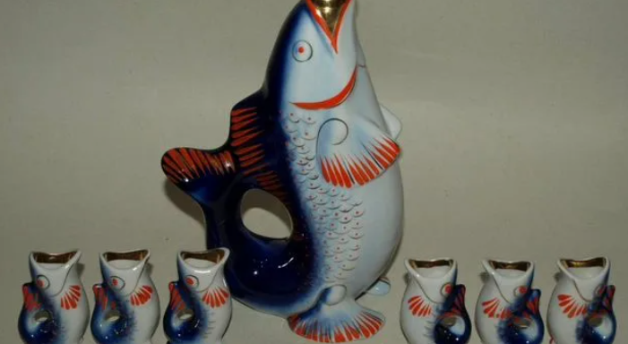 Официально набор для напитков в форме рыбок в СССР назывался «Рыбки». Однако в народе у него было множество названий, среди которых чаще всего встречались «Семейство карпов», «Золотые рыбки», «Форелевая семья» и «Ликерный набор» Внук Евлампий приехал к деду Евстафию на летние каникулы. Ходил по дому, рассматривал всякую деревенскую утварь, старые вещи. Подошёл к серванту, заглянул за стекло и увидел там набор синих фарфоровых рыбок. Большая, как карп, и шесть маленьких вокруг неё. - Дед, это что за красота? - спросил внук, Для украшения стоят? Евстафий усмехнулся, подошёл к серванту, открыл дверцу и осторожно достал большую рыбу. - Для красоты, говоришь? - покрутил он графин в руках, Ну, сейчас да, для красоты. А раньше это был сервиз для напитков. Называется «Семейство карпов». В каждом доме в Советском Союзе такой стоял. У кого в серванте, у кого на полке. Евлампий взял одну из маленьких рыбок, повертел. - Это рюмка что ли? - Именно, кивнул дед, Рюмка. А большая рыба, графин, семьсот