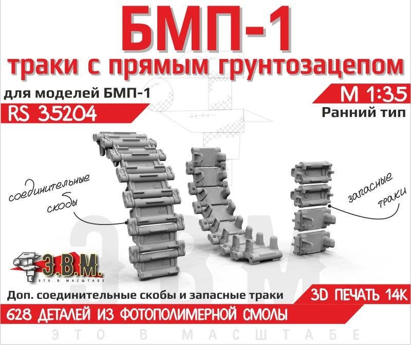 Э.В.М. выпустили ранний тип траков для БМП-1 с прямым грунтозацепом в 1/35 масштабе.