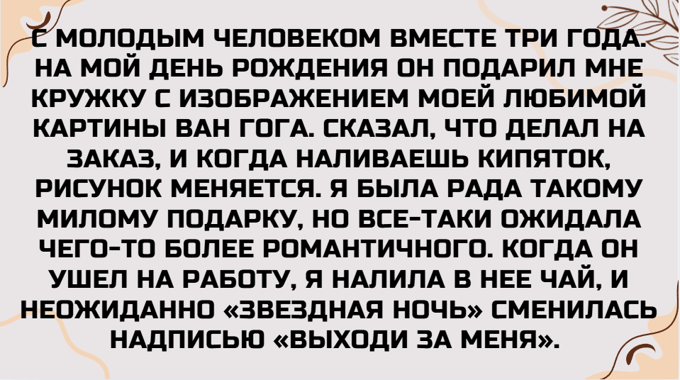 - С молодым человеком вместе три года. На мой день рождения он подарил мне кружку с изображением моей любимой картины Ван Гога. Сказал, что делал на заказ, и когда наливаешь кипяток, рисунок меняется. Я была рада такому милому подарку, но все-таки ожидала чего-то более романтичного. Когда он ушел на работу, я налила в нее чай, и неожиданно «Звездная ночь» сменилась надписью «Выходи за меня». Первый раз в жизни заплакала от счастья из-за очередной подаренной кружки.