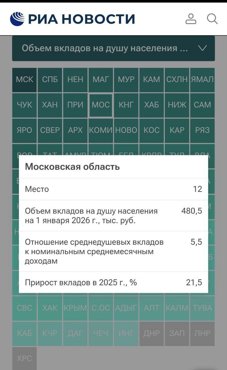 📊 Подмосковье заняло 12 место среди регионов РФ по объёму вкладов на душу населения