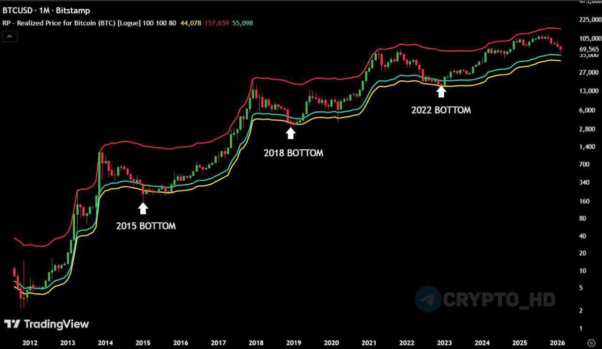 😳 Очередной график из Twitter – криптаны ожидают дно по BTC в районе $45,000-55,000. Ранее: - фрактал 2018, 2022 гг. - паттерн «Голова и плечи» - циклы BTC Crypto Headlines