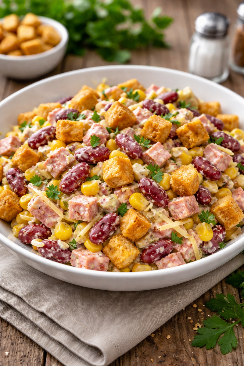 Салат «5 минут — и гости в восторге»: фасоль, кукуруза, колбаса и хрустящие сухарики!