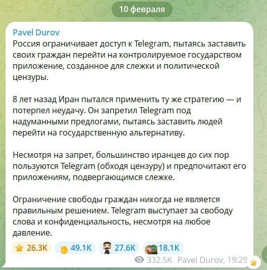 : Россия ограничивает доступ к Telegram в попытке заставить своих граждан перейти на контролируемое государством приложение, созданное для слежки и политической цензуры. 8 лет назад Иран попробовал ту же стратегию — и потерпел неудачу. Он запретил Telegram под выдуманными предлогами, пытаясь заставить людей перейти к государственной альтернативе. Несмотря на запрет, большинство иранцев по-прежнему используют Telegram (обходя цензуру) и предпочитают его приложениям для слежки. Ограничение свободы граждан никогда не является правильным ответом. Telegram означает свободу слова и конфиденциальность, независимо от давления. #durov #telegram ➖➖➖➖➖➖➖➖➖➖ 🎁 Купить / продать подарки + гайд 🪙 Купить / продать звезды 💬 Общий чат