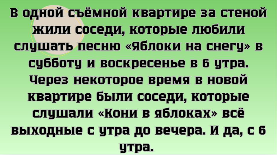 - В одной съёмной квартире за стеной жили соседи, которые любили слушать песню «Яблоки на снегу» в субботу и воскресенье в 6 утра. Через некоторое время в новой квартире были соседи, которые слушали «Кони в яблоках» всё выходные с утра до вечера. И да, с 6 утра. © Виктория Дубринская