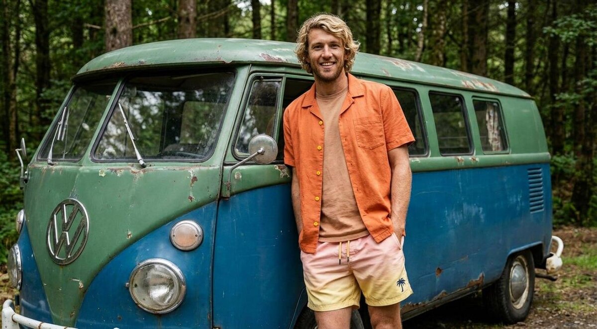 Модель: Nano Banana Сгенерировать🪄 Композиция и поза: Мужчина в полный рост стоит рядом с винтажным фургоном Непринужденно опирается на автомобиль, руки в карманах Расслабленная, естественная поза Фургон: Двухцветный: верхняя часть зеленая, нижняя — синяя Винтажный стиль с видимыми потертостями краски Текстура старой, изношенной краски с патиной времени Одежда: Рубашка: расстегнутая, с коротким рукавом, оранжевого цвета, желтые пуговицы Шорты: градиент от светло-розового к желтому, с кулиской и логотипом пальмы Текстуры: гладкая ткань рубашки, мягкий хлопок шорт Локация и освещение: Открытое пространство на природе Лесной фон с деревьями Естественное дневное освещение Мягкие, рассеянные тени Цветовая палитра: Зеленый (фургон) Оранжевый (рубашка) Розовый и желтый (шорты) Синий (нижняя часть фургона) Детализация: Естественная текстура кожи с видимыми порами Анатомически правильные руки и пропорции тела Реалистичная передача материалов и поверхностей