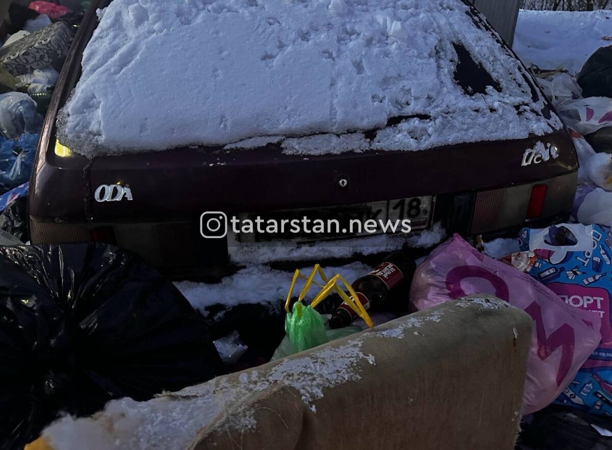Брошенный у контейнерной площадки на улице Гудованцева в Казани автомобиль уже больше недели стоит заваленный мусором