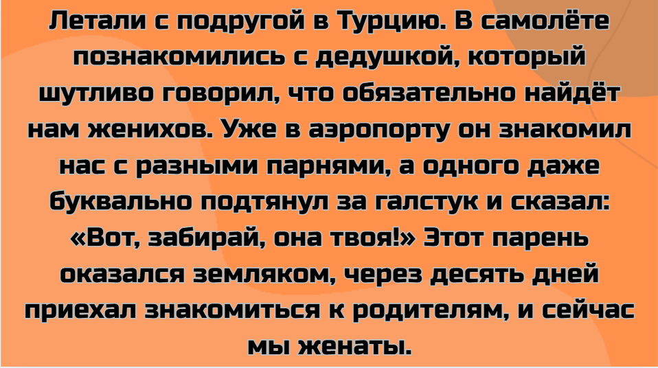 - Летали с подругой в Турцию. В самолёте познакомились с дедушкой, который шутливо говорил, что обязательно найдёт нам женихов. Уже в аэропорту он знакомил нас с разными парнями, а одного даже буквально подтянул за галстук и сказал: «Вот, забирай, она твоя!» Этот парень оказался земляком, через десять дней приехал знакомиться к родителям, и сейчас мы женаты.