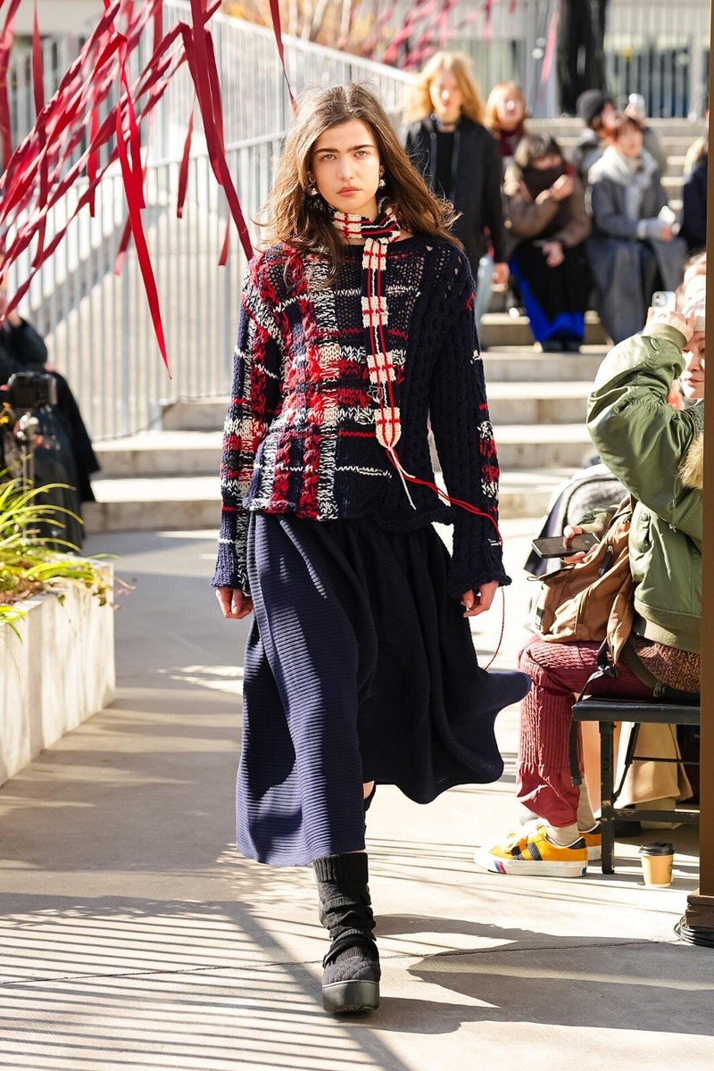Клетка здесь не просто узор, а основа формы. Она то цельная, то «разобранная» и встроенная в вязку. Причём сделана не из шерсти, а из лёгкого трикотажа — знакомо на вид, но современно по ощущению. Что можно взять на заметку Одежда не сковывает, она движется вместе с телом. Это вещи, которые хочется носить, а не просто рассматривать. Если вам близка мода про нюансы, фактуры и спокойную с