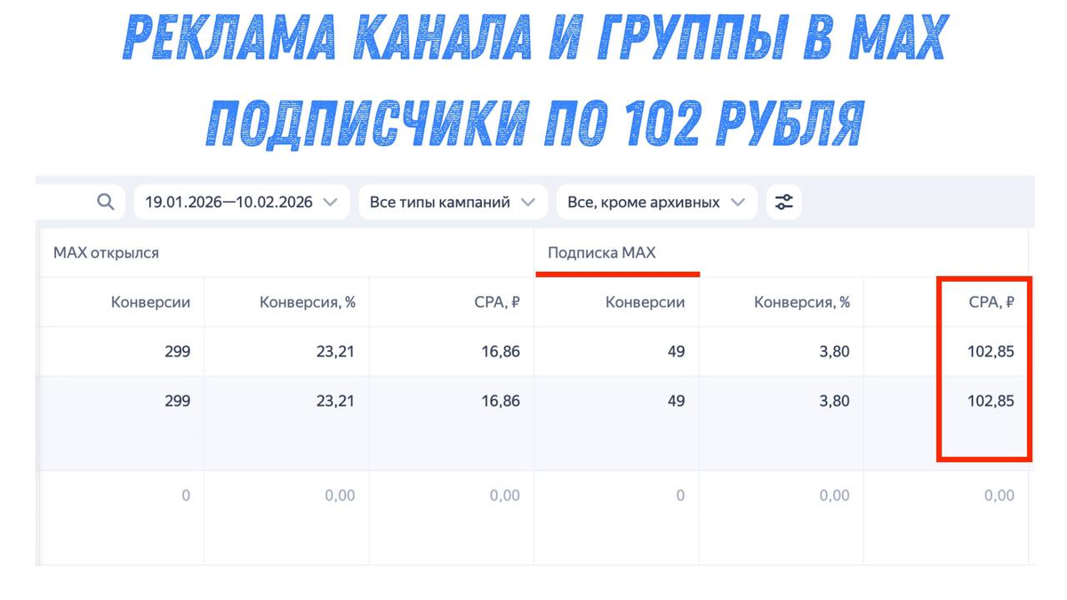 Рекламу запускаем в яндексе, ведем на канал в МАХ, по пути немного фильтруем от тех, у кого приложение не установлено.