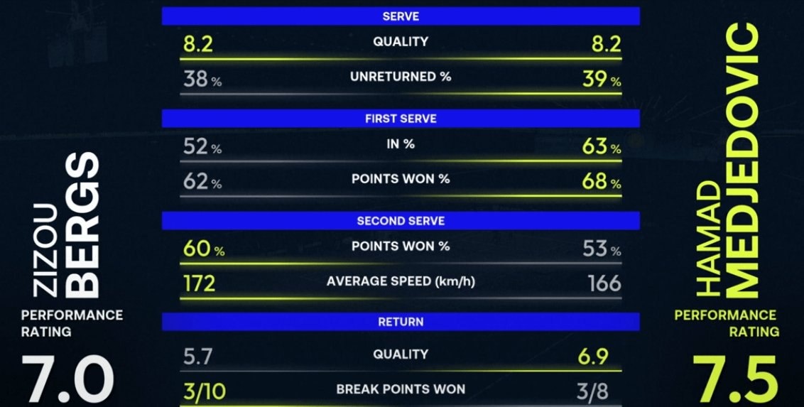 ). Как сказал один фанат: "Это был самый "бергсовский" матч Бергса. Но и самый "хамадтастичный" матч Хамада". Бергс вел 5-2 с двойным брейком в первом сете, имел сет-пойнт при 5-2 40-30, и с этого момента все пошло наперекосяк 📉. Матч-пойнт был одним из тех сенсационных моментов, когда один игрок от отчаяния закидывает защитную свечу, а другой пытается пробить смэш, но попадает ободом ракетки 🎾. Подпишись на Эйс и точка