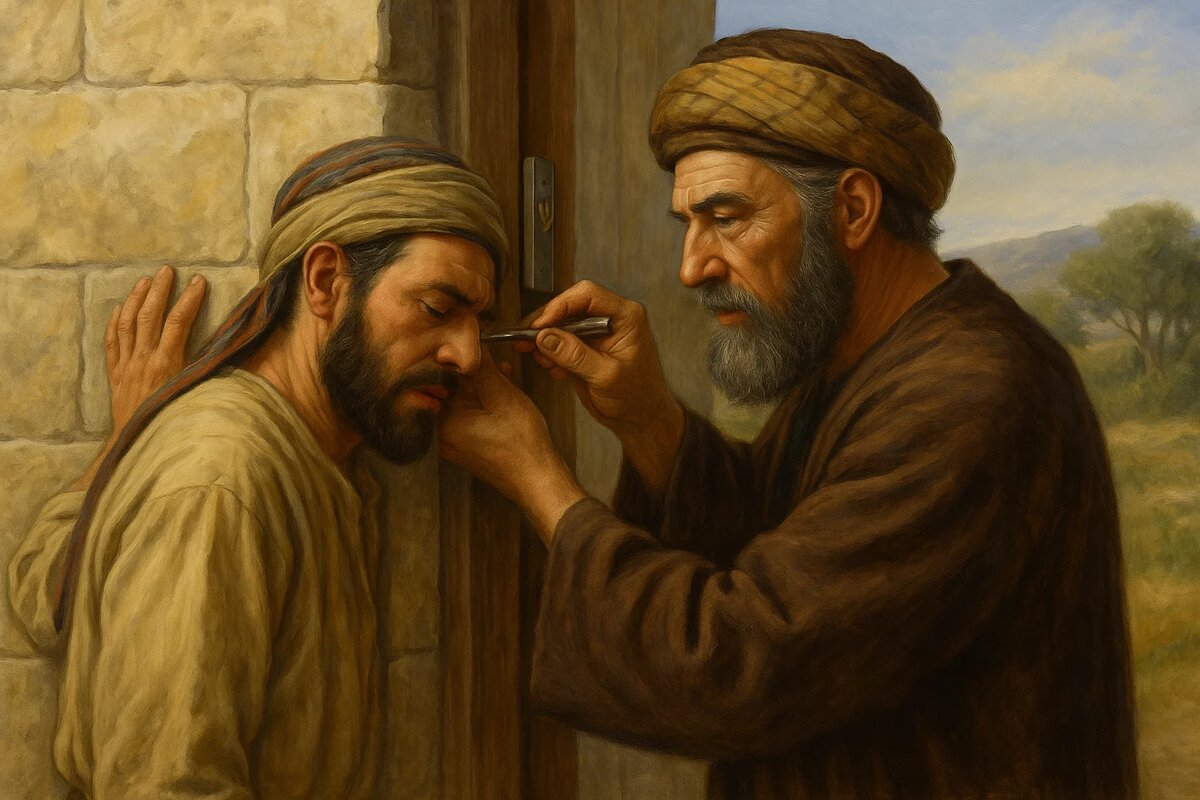 В нашей главе обсуждается положение еврейского раба. Такой раб – это еврей, который оказался в рабстве по одной из двух причин: либо из-за крайней нужды, когда его финансовое состояние не позволяет обеспечить себя самостоятельно, и он продает себя в рабство, чтобы хозяин предоставлял ему необходимое; либо это вор, не имеющий возможности возместить стоимость украденного имущества, и который продается судом в рабство для покрытия долга. Через шесть лет службы раб должен быть освобожден, независимо от того, заработал он достаточно для погашения долга или на собственное содержание или нет. Однако, если после шести лет службы раб заявляет: «Я люблю моего хозяина, мою жену и моих детей и не желаю выходить на свободу» (Шмот 21:5), его хозяин должен привести его к суду. Если раб перед судьями подтверждает свое желание остаться, хозяин приводит его к двери или ко дверному косяку своего дома (или дома другого) и прокалывает ему правое ухо шилом или другим инструментом, обозначая, что он останет