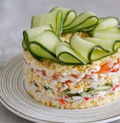 Простой и понятный салат, с доступными ингредиентами и лёгкий в приготовлении. Салат слоёный, но постарайтесь не сильно утрамбовывать слои ложкой, сохраните его воздушность. Салат получается вкусным и праздничным. Попробуйте его приготовить. Вот рецепт крабового салата. Продукты необходимые для его приготовления: