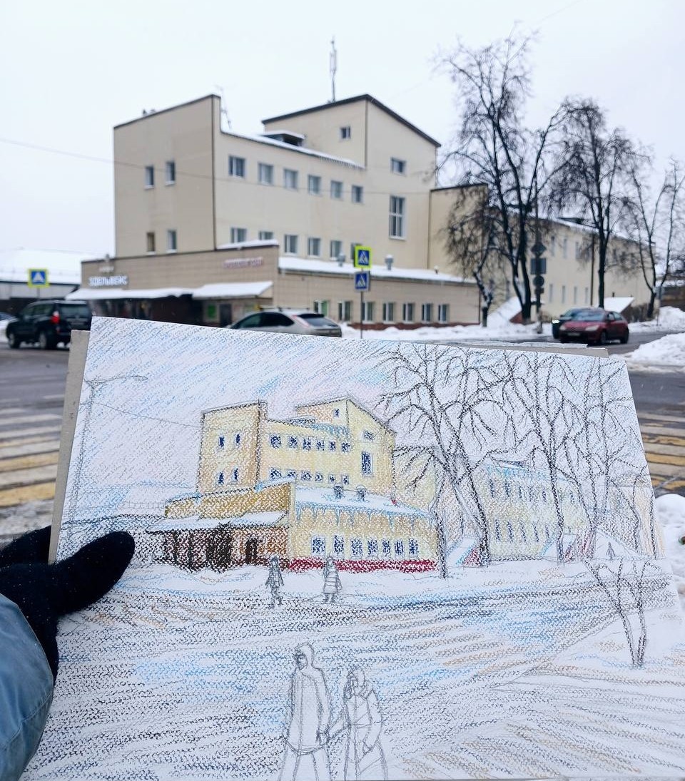 Александра Лысенко, художник- график из Королева, резидент Ассоциации художников - пленэристов с 2025 года. Александра - куратор пленэров по теме конструктивизма в Королеве. Я стою на улице Ленина и впервые по‑настоящему вглядываюсь в город, что для многих остаётся лишь размытым силуэтом за окном электрички или автомобиля. В руках у меня скетчбук: готовлюсь к конкурсу «Код города: конструктивизм». Сегодня мне нужно не просто выискать красивый ракурс — я ищу приключение, спрятанное в линиях архитектуры. Передо мной — дом №12, старая городская баня. Ты бы, наверное, прошёл мимо, решив, что это просто странное здание с тяжёлыми объёмами. Но присмотрись: оно похоже на огромный гусеничный трактор, выехавший из 1930‑х. Трёхэтажный южный объём — будто мотор, по бокам — пристройки‑«гусеницы», в центре — высокая «кабина тракториста», а с севера — двухэтажный «прицеп». Когда понимаешь эту метафору, город вдруг начинает разговаривать с тобой на языке форм. Листаю историческую справку и узнаю, что