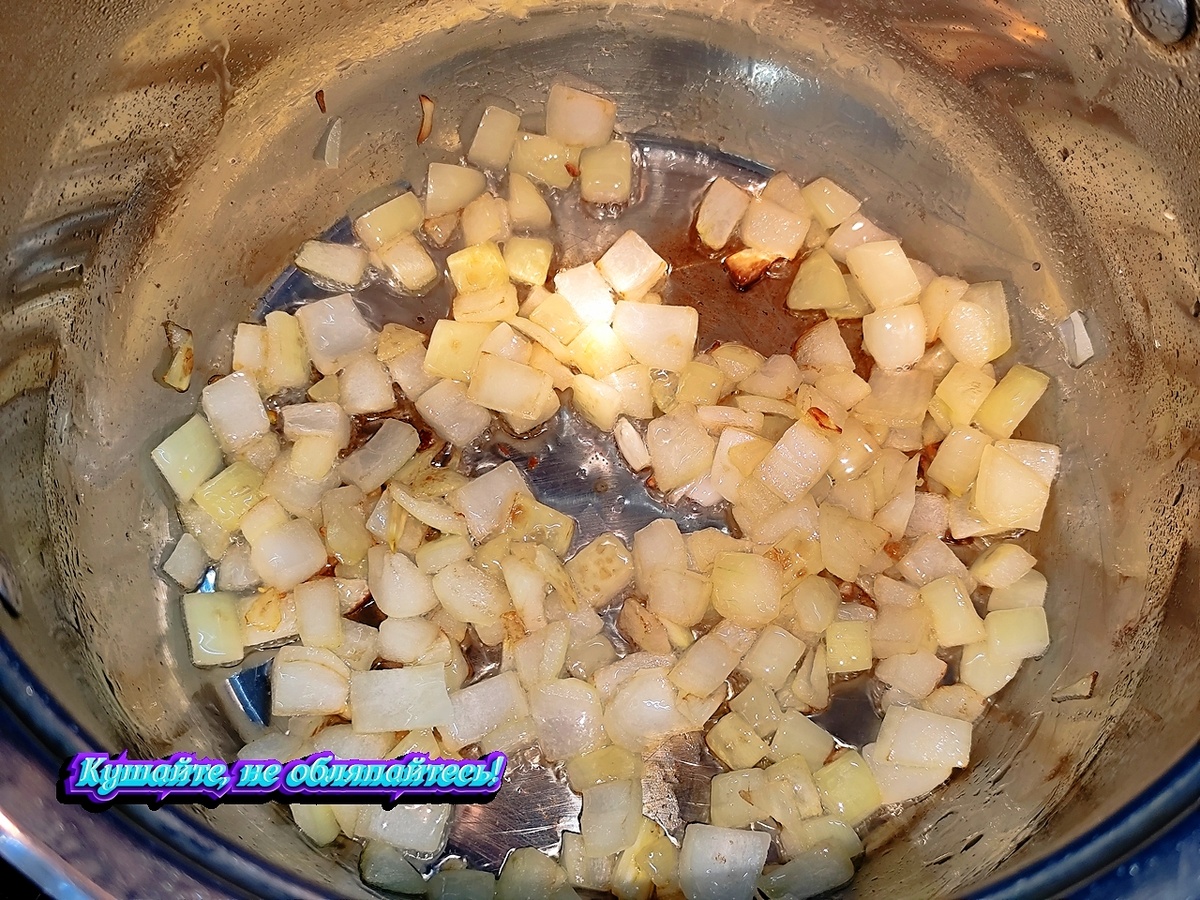 В кастрюле с толстым дном на среднем огне разогреваем растительное масло и пассеруем лук, пока он не начнет становиться золотистого цвета.