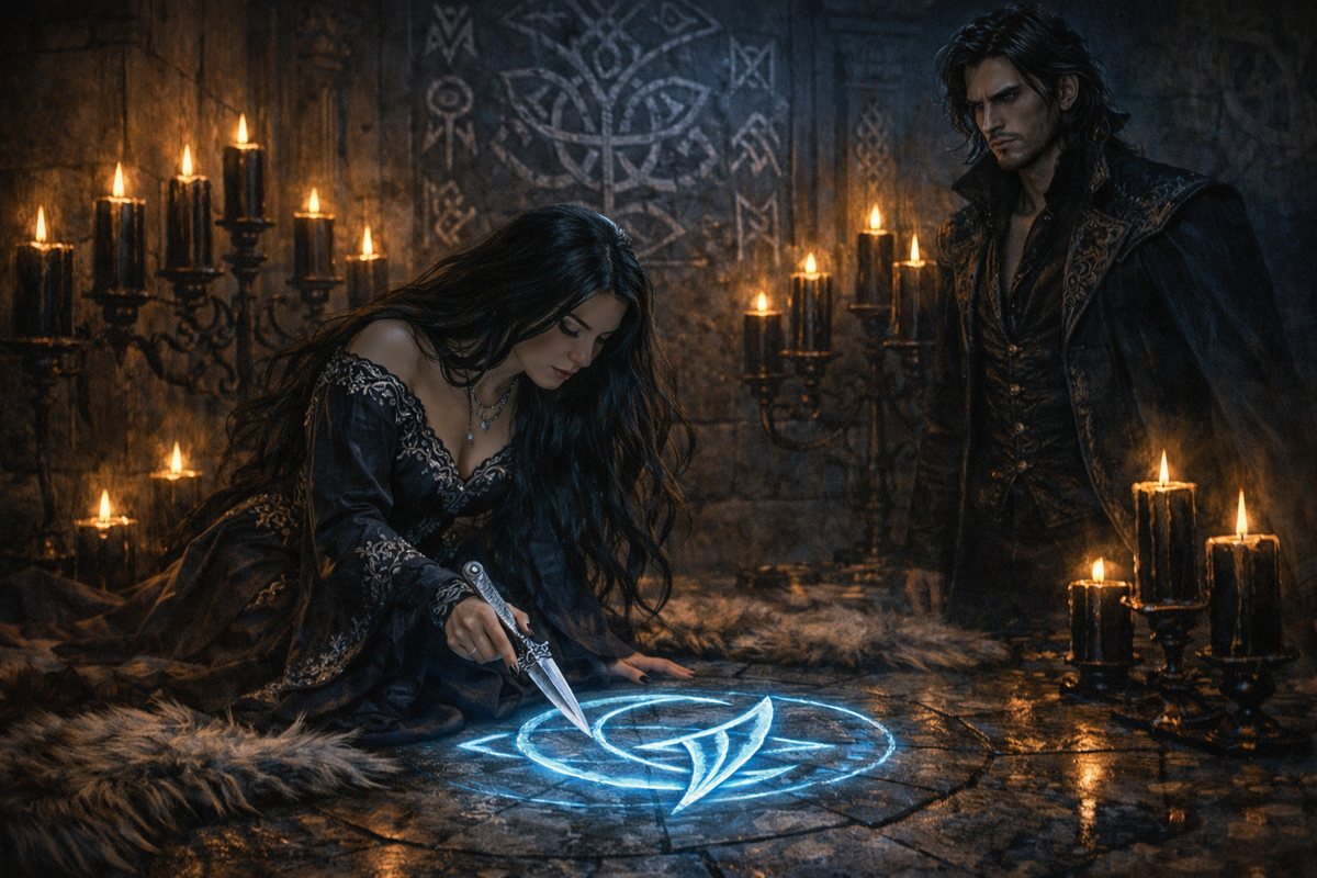 Они провели ночь в старинном зале, окружённом мерцающим светом девяти чёрных восковых свечей. Их пламя отбрасывало причудливые тени на стены, украшенные древними рунами и мистическими узорами. Элари, облачённая в тёмное платье с серебряной вышивкой, осторожно опустилась на пол, покрытый мягким ковром из волчьего меха. Её длинные волосы струились по плечам, словно ночной туман.