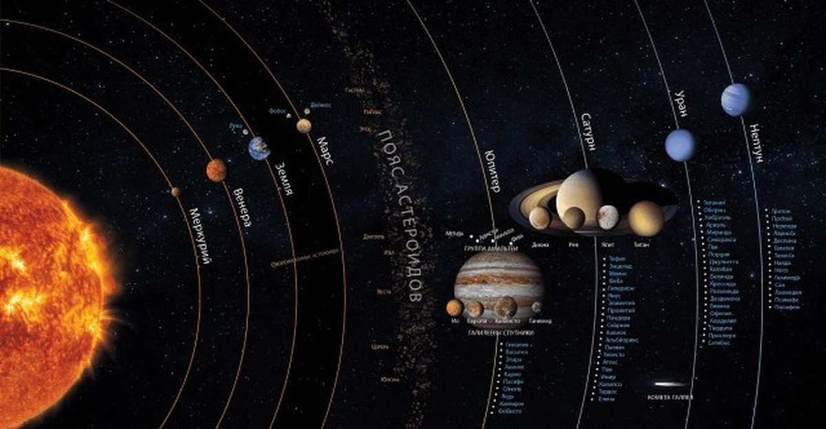 Наша планетная система сформировалась около 4,6 млрд лет назад из газопылевого облака. В центре — Солнце (звезда), вокруг него по орбитам движутся: