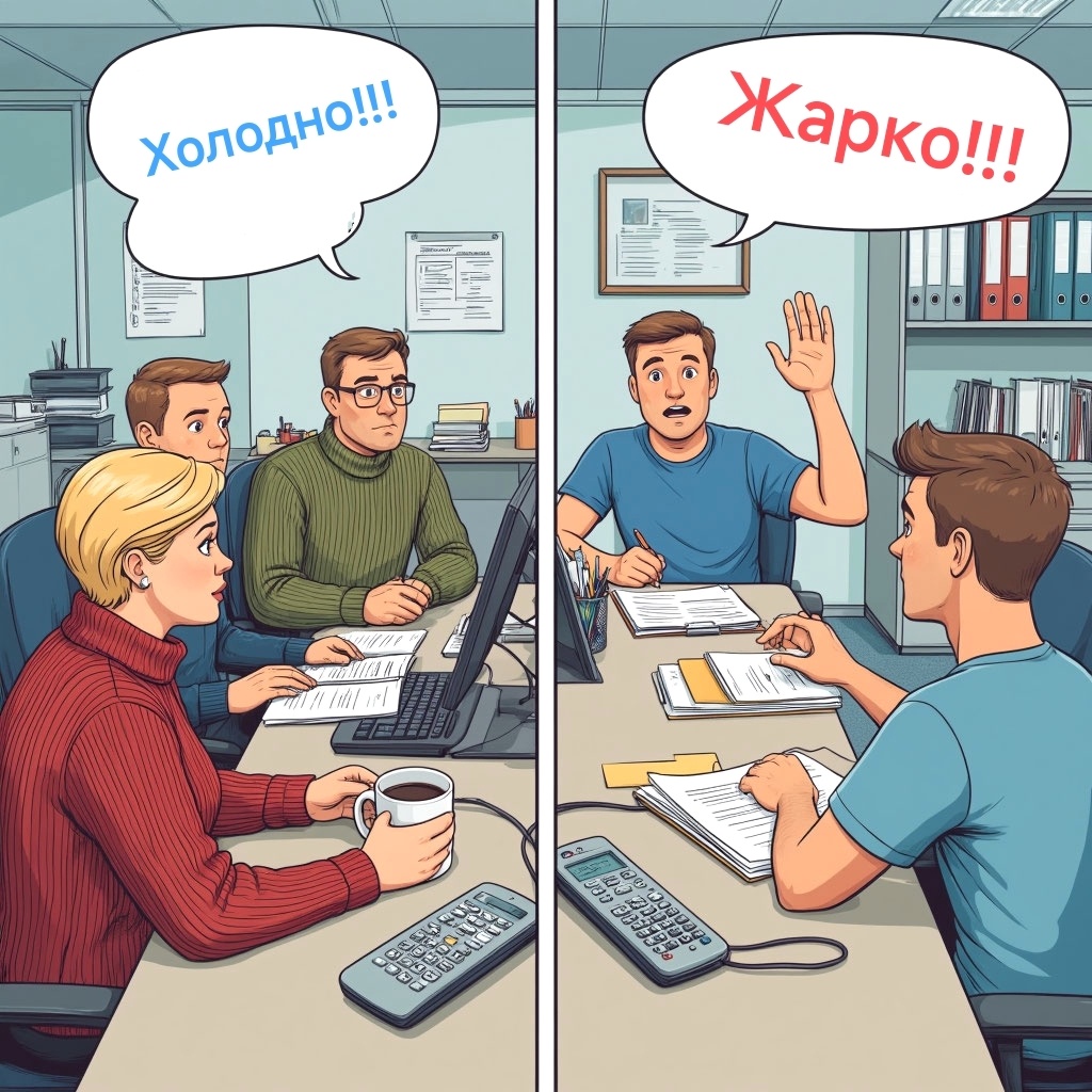 3. Борьба за личный комфорт в общем пространстве. Офис — это территория, где личные потребности сталкиваются с коллективными. Ваше «мне жарко» против моего «мне холодно» — это мини-модель всех социальных конфликтов. Мы отстаиваем своё право чувствовать себя хорошо, даже если это ущемляет другого.