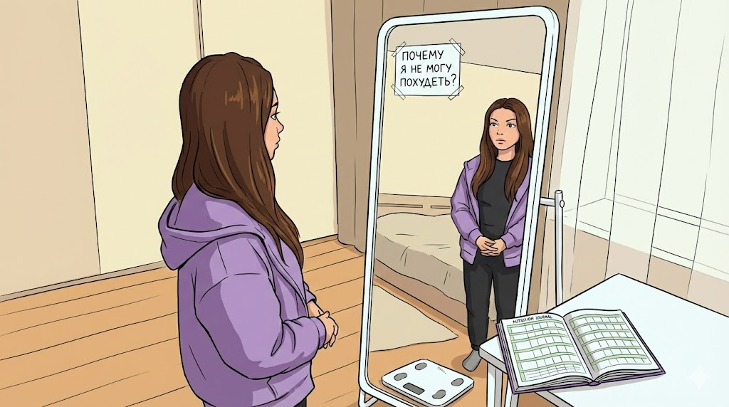 Ты смотришь на себя и понимаешь: формально всё нормально. Вес в пределах нормы. Одежда сидит. Люди говорят: «Да ты что, тебе худеть не надо».