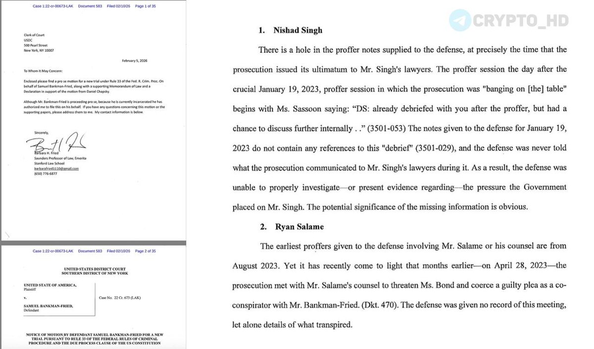 Напомним: Сейчас основатель FTX отбывает тюремных срок (25 лет) за мошенничество. А Дональд Трамп ранее заявлял, что не собирается его помиловать. Сэм Бэнкман-Фрид утверждает, что обнаружил новые доказательства, которые могли бы его оправдать: ➥ Скрытая информация о свидетеле Нишаде Сингхе. ➥ Необнародованная информация о встрече прокуроров с адвокатом Райана Саламе в апреле 2023 года. Основатель FTX представляет себя сам после увольнения адвоката, ходатайство подала его мать. Ранее: - FTX не была банкротом - «тюремные записки» Crypto Headlines