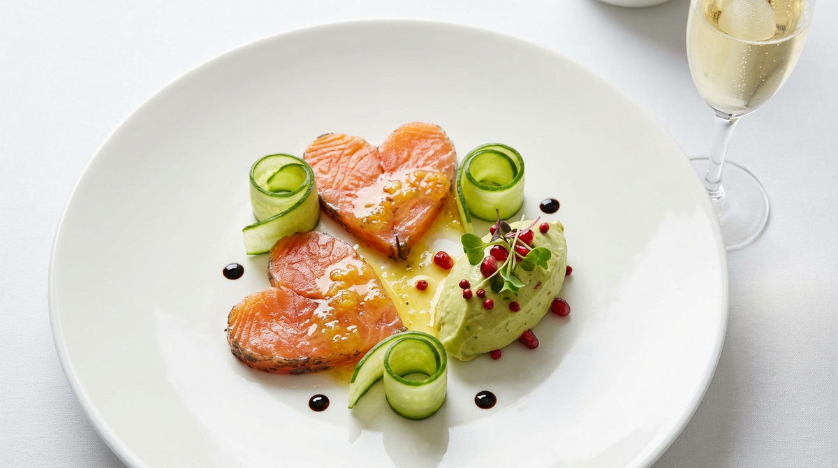 Вот идея “вау-эффекта” на День святого Валентина — выглядит как из ресторана, а по факту делается дома без сложных техник. Это эффектно: форма сердечек, контраст цветов, подача “как в fine dining”, и при этом всё реально собрать за 15–20 минут. Возьми маленькую формочку-сердце (или вырежи шаблон из картона) и вырежи 4–6 сердечек из лосося. Обрезки не выбрасывай — пойдут в начинку/украшение. Разомни авокадо, добавь сливочный сыр (или йогурт), сок лайма, щепотку соли и перца. Взбей вилкой до кремовой текстуры (можно блендером 10 секунд). Смешай: оливковое масло + 1 ч. л. мёда + немного сока лайма + цедру. Это даст блеск и “дорогой” вкус. На тарелку выложи 2–3 сердечка лосося, рядом — кнель мусса (ложкой), добавь ленты огурца/цукини (овощечисткой), полей заправкой. Сверху — микрозелень, пару зёрен граната или щепотку розового перца. Всё: выглядит на миллион. Если понравился рецепт - ставь "лайк" - поддержи канал :)