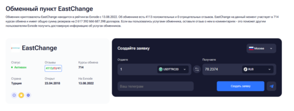 EastChange — это высококлассный сервис с более чем 5-летним опытом работы и свыше миллионом успешных сделок. Обменник работает круглосуточно, среднее время обмена составляет около 15 минут. EastChange гарантирует конфиденциальность, лучшие курсы и профессиональную поддержку клиентов. Офис в Москве работает с 11:00 до 20:30, а онлайн-сервис доступен пользователям по всей России и миру, обеспечивая удобство и безопасность любых операций с USDT и другими криптовалютами.